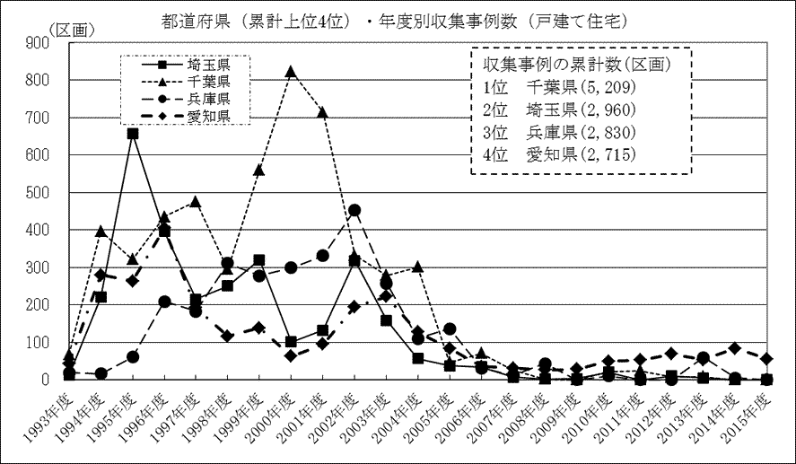 都道府県別にみると、第1位は愛知県の56区画、第2位は福岡県の24区画、次いで第3位は東京都の5区画で、収集された事例の約60%が愛知県となっている。福岡県の事例は、農地の開発による新たな宅地造成によるものである。また、土地面積については、最大面積が200m2を超える事例は51件中12件と全体の24%となっており、前年度(36%) と比較して小規模な物件の収集事例が増加している。
