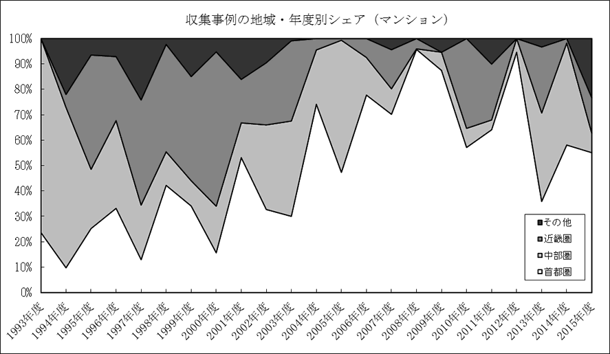 当センターでは、1994年以降、自主研究課題として、定期借地権制度と個人・世帯の住宅取得ニーズとの関連性の定量的検証のための基礎データとして、定期借地権付分譲住宅事例のデータ収集を行っている。